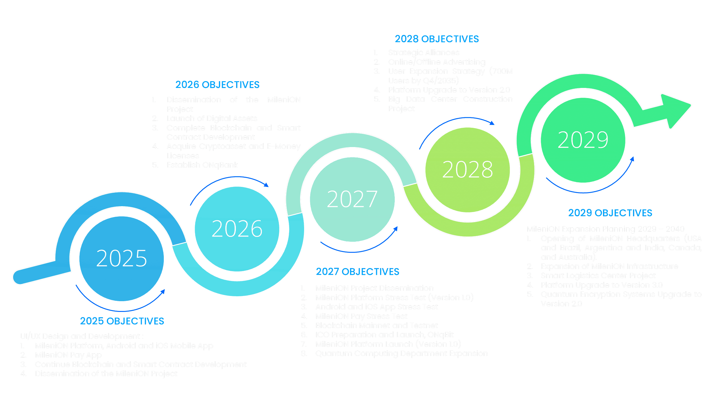 MileniON moves forward with a clear, strategic, and ambitious roadmap. Each phase of the project has been designed to build a solid, scalable, and ever-evolving Digital Ecosystem. From initial technological development to global expansion, every step brings us closer to a new era of integral digitalization. The future is already underway!