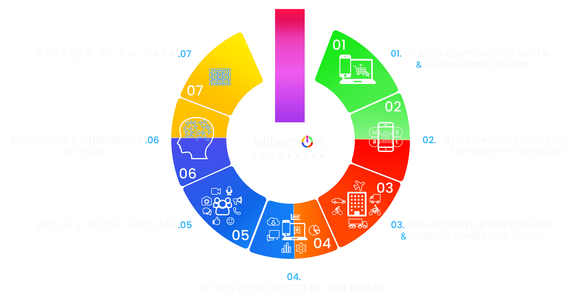A MileniON desenvolve um Ecossistema Digital sem precedentes que integra sete linhas de negócio estratégicas para oferecer soluções integrais, disruptivas e escaláveis. É a sinergia perfeita entre tecnologia de ponta, inovação constante e uma visão global que redefine o futuro digital.